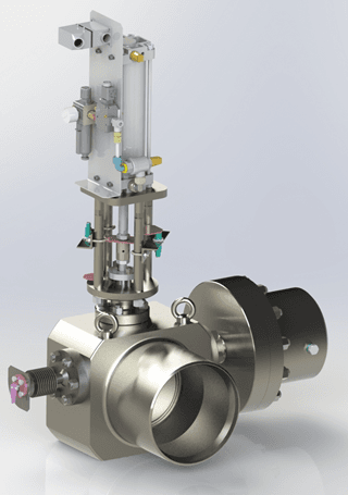 Alternatively, can be the check valve equipped with linear actuator placed vertically which close the disc of the check valve from above. The type of actuator is specified by customer, and it can be pneumatic or hydraulic actuator.